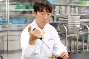 私たちは、素材の基礎研究の段階から、「安全性」を確認しています。この確認だけで2年もの月日を費やすこともあります。その部分をクリアしなければ当然、製品開発も断念しなくてはなりません。私たちは食品研究所、バイオ&ファインケミカル研究所と連携することにより高いレベルの「安全性」を追求しています。オリジナリティの高い素材を研究しているだけに、「安全性」への確認に漏れがあってはなりません。