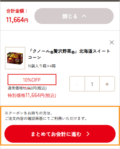 ④注文内容を確認して、「まとめてお会計に進む」ボタンをクリックするとお会計に進みます。