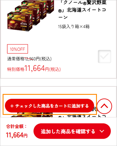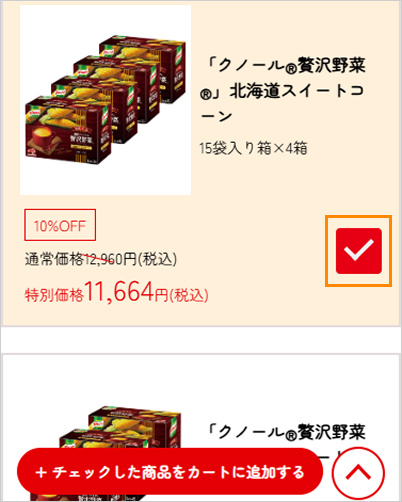 ③チェックボックスをクリックすると、「✅」がつき、ページ下の「+チェックした商品をカートに追加する」をクリックするとカートに商品が投入されます。