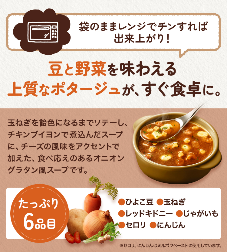 ・原材料名ひよこ豆(アメリカ)、ソテーオニオン、砂糖、赤いんげん豆、乳等を主要原料とする食品、チキンエキス、乾燥マッシュポテト、ミルポワペースト、オニオンパウダー、食塩、マッシュルームエキス、チキンミートペースト、チーズパウダー、デキストリン、酵母エキス、こしょう/糊料(加工デンプン、キサンタン)、調味料(アミノ酸等)、カラメル色素、香料