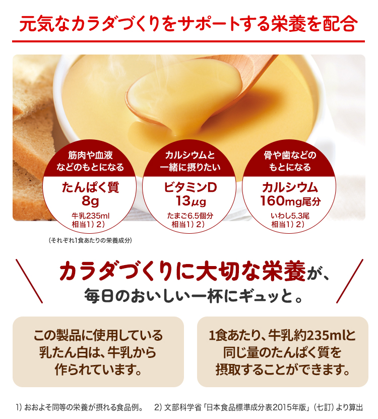 ・栄養成分表示1食分(26.1g)あたりエネルギー110kcal、たんぱく質8.0g、脂質2.7g、炭水化物13g、食塩相当量1.0g、ビタミンD13.0μg、カルシウム160mg