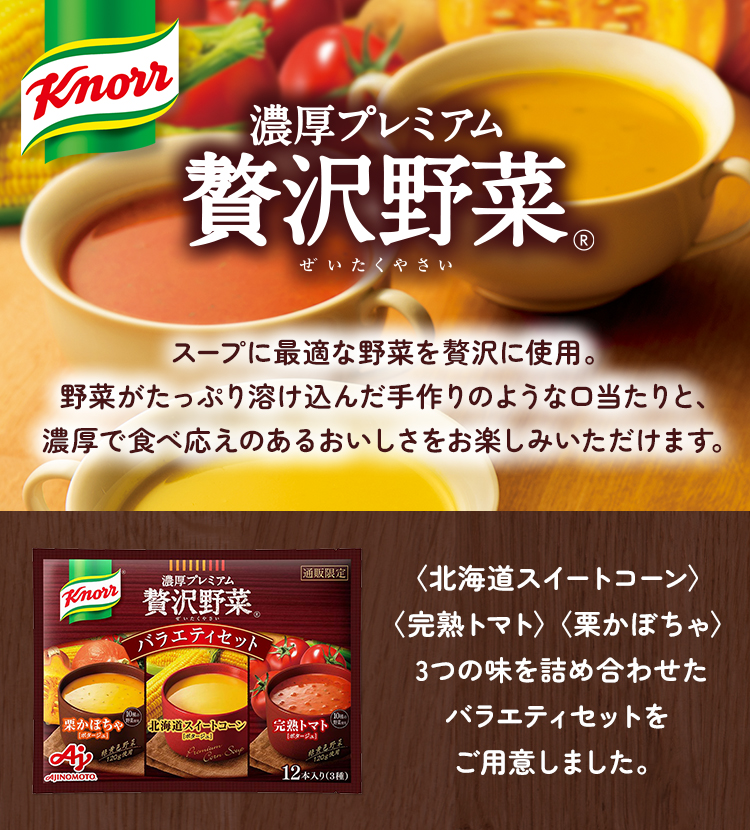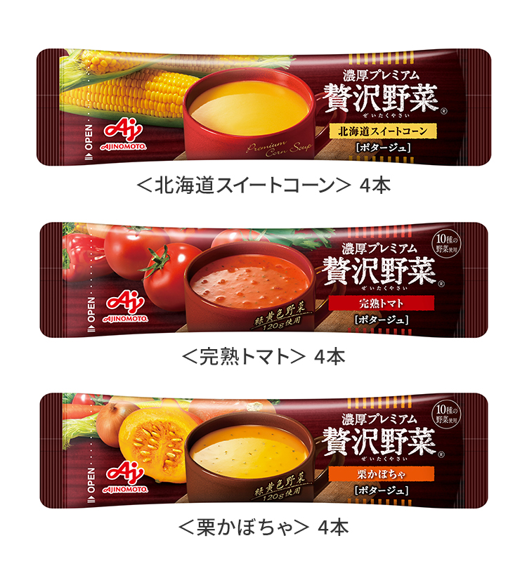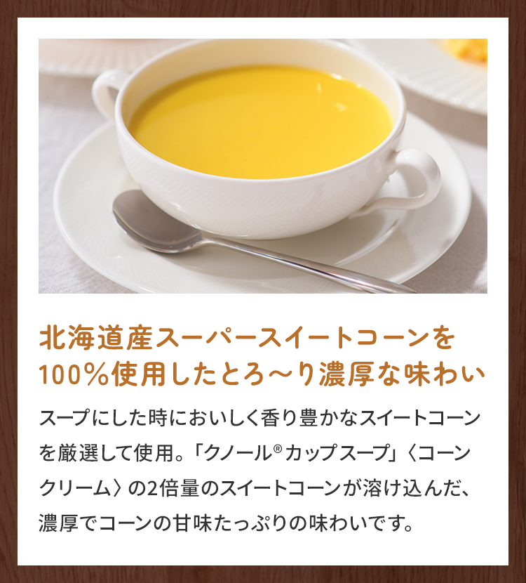 ・原材料名北海道スイートコーンスイートコーン(日本)、全粉乳、デキストリン、でん粉、食用加工油脂、食塩、砂糖、チキンエキス、コーンバターパウダー、バターソテーオニオンパウダー、クリーミングパウダー、たまねぎ、野菜エキス調味料、香辛料、ミルポアパウダー(たまねぎ、にんじん、セロリ、植物油脂、でん粉、ねぎ、バター)、マッシュポテト/調味料(アミノ酸)、乳化剤、増粘剤(グァーガム)栗かぼちゃ かぼちゃ(アメリカ)、食用加工油脂、クリーミングパウダー、食塩、デキストリン、でん粉、全粉乳、砂糖、バターソテーオニオンパウダー、ミルポアパウダー(たまねぎ、にんじん、セロリ、植物油脂、でん粉、ねぎ、バター)、チーズ、スイートコーン、たまねぎ、マッシュポテト、香辛料、トマトパウダー、はくさいエキス、うきみ(パセリ)/乳化剤、調味料(アミノ酸)完熟トマトトマトパウダー(国内製造)、乳等を主要原料とする食品、クリーミングパウダー、トマトフレーク、デキストリン、チーズ、砂糖、でん粉、赤ピーマン、食塩、食用加工油脂、ミルポアパウダー(たまねぎ、にんじん、セロリ、植物油脂、でん粉、ねぎ、バター)、マッシュポテト、たまねぎ、香辛料、スイートコーン、酵母エキス、たん白加水分解物、発酵トマト調味料、大豆発酵調味料、うきみ(バジル、パセリ)/調味料(アミノ酸等)、酸味料