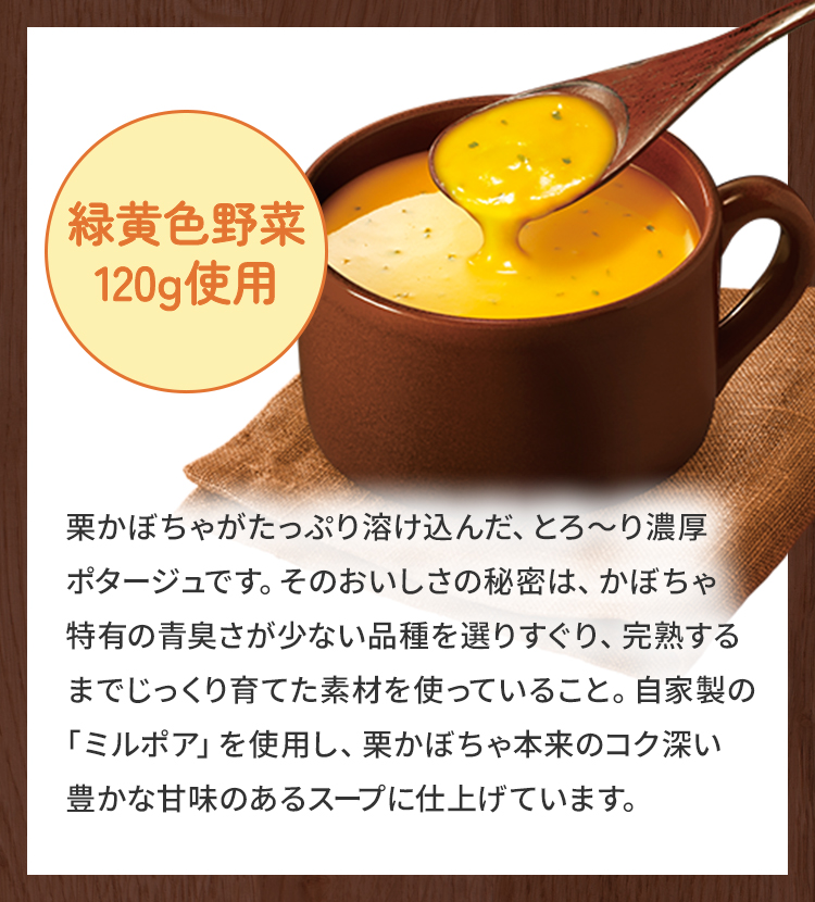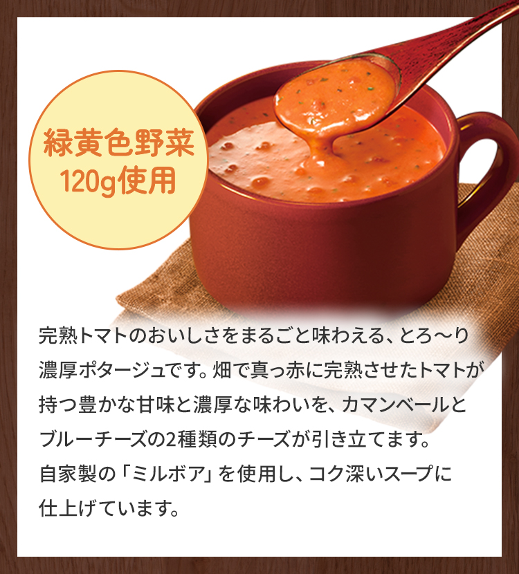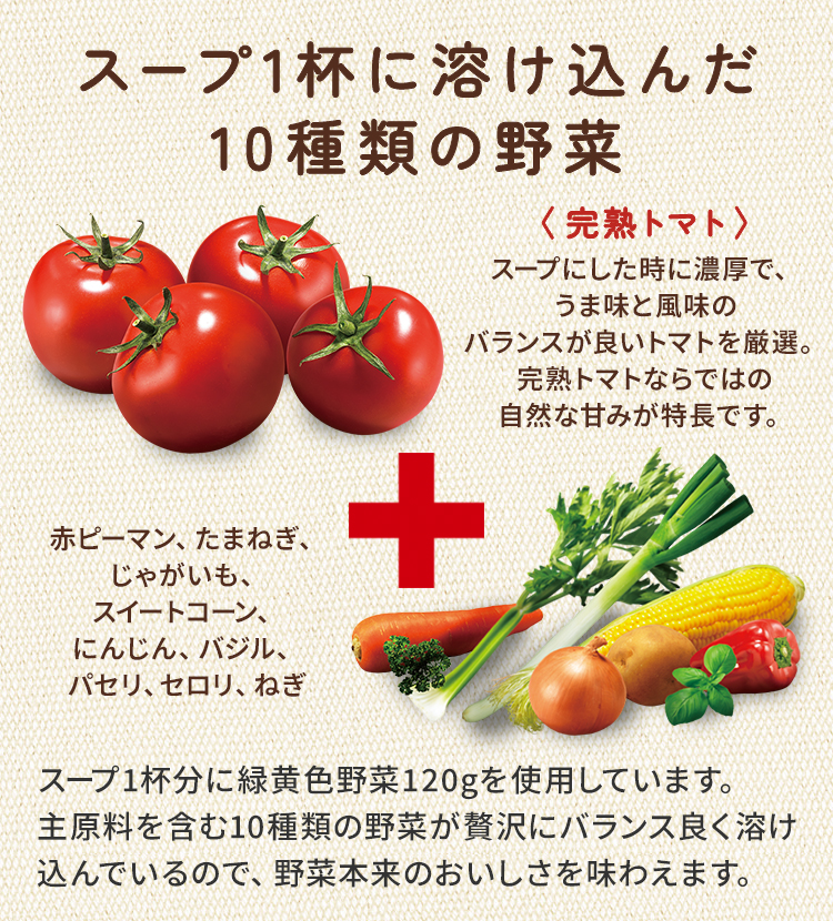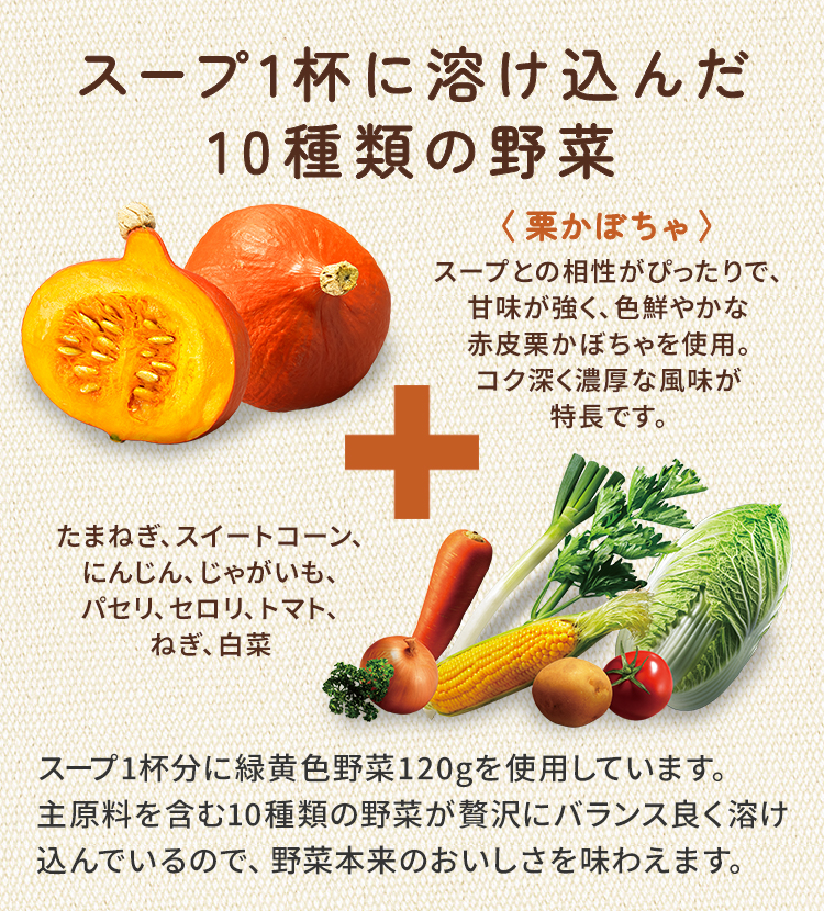 スープ1杯分に緑黄色野菜120gを使用しています。 主原料を含む10種類の野菜が贅沢にバランス良く溶け込んでいるので、野菜本来のおいしさを味わえます。