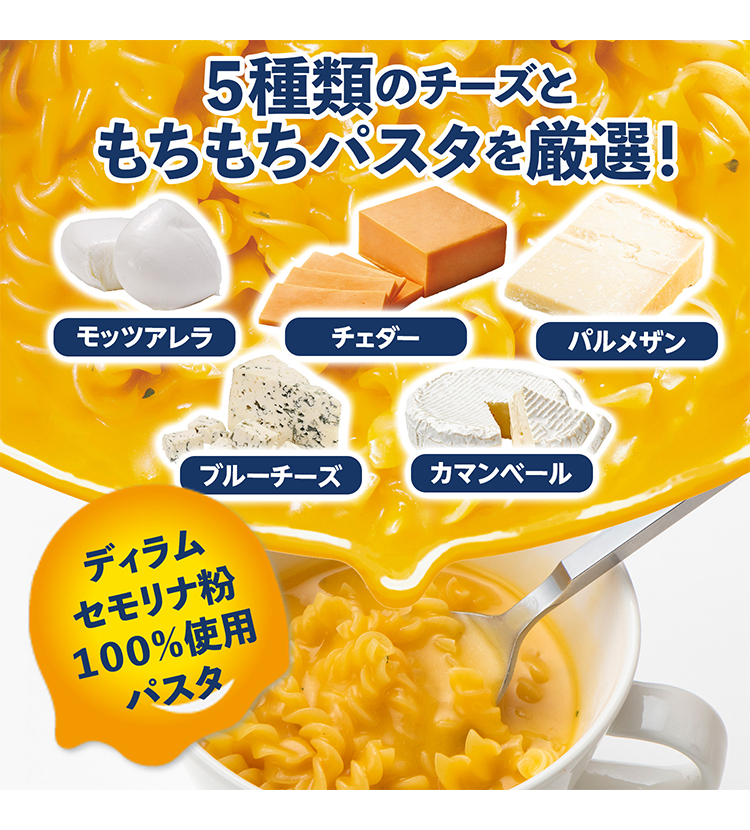 ・原材料名パスタ(ベルギー製造)、チーズパウダー、クリーミングパウダー、デキストリン、食用加工油脂、でん粉、乳糖、食塩、砂糖、ポテトパウダー、全粉乳、オニオンパウダー、酵母エキス、香辛料、パセリ、バターソテーオニオンパウダー、チキンエキス/加工デンプン、調味料(アミノ酸等)、グァーガム、乳化剤、香料、酸味料、着色料(カロチノイド色素)