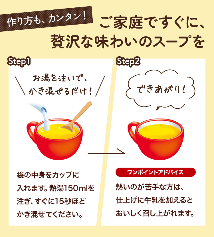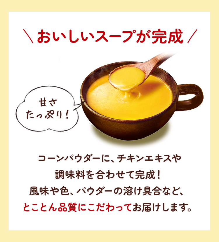 ・原材料名スイートコーン(日本)、全粉乳、デキストリン、でん粉、食用加工油脂、食塩、砂糖、チキンエキス、コーンバターパウダー、バターソテーオニオンパウダー、クリーミングパウダー、たまねぎ、野菜エキス調味料、香辛料、ミルポアパウダー(たまねぎ、にんじん、セロリ、植物油脂、でん粉、ねぎ、バター)、マッシュポテト/調味料(アミノ酸)、増粘剤(グァーガム)