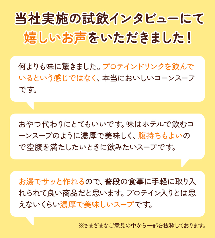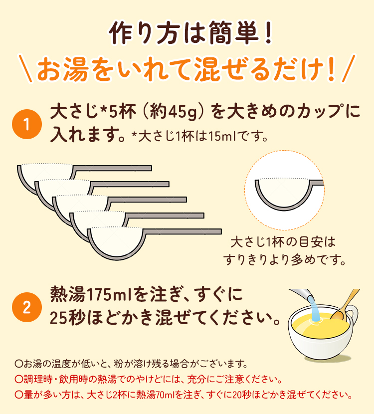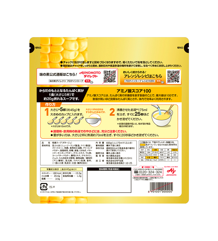 ・原材料名乳たん白(ニュージーランド製造、ドイツ製造)、スイートコーン、乳糖、食用加工油脂、クリーミングパウダー、脱脂粉乳、砂糖、食塩、たまねぎ、バターソテーオニオンパウダー、チキンエキス、でん粉、コーンバターパウダー、酵母エキス、デキストリン、こしょう、たん白加水分解物、植物油脂/調味料(アミノ酸等)、乳化剤、クチナシ色素、香料