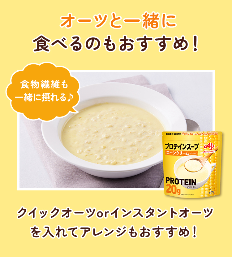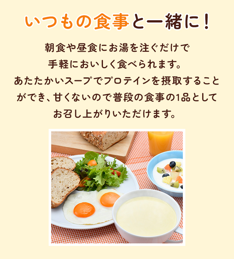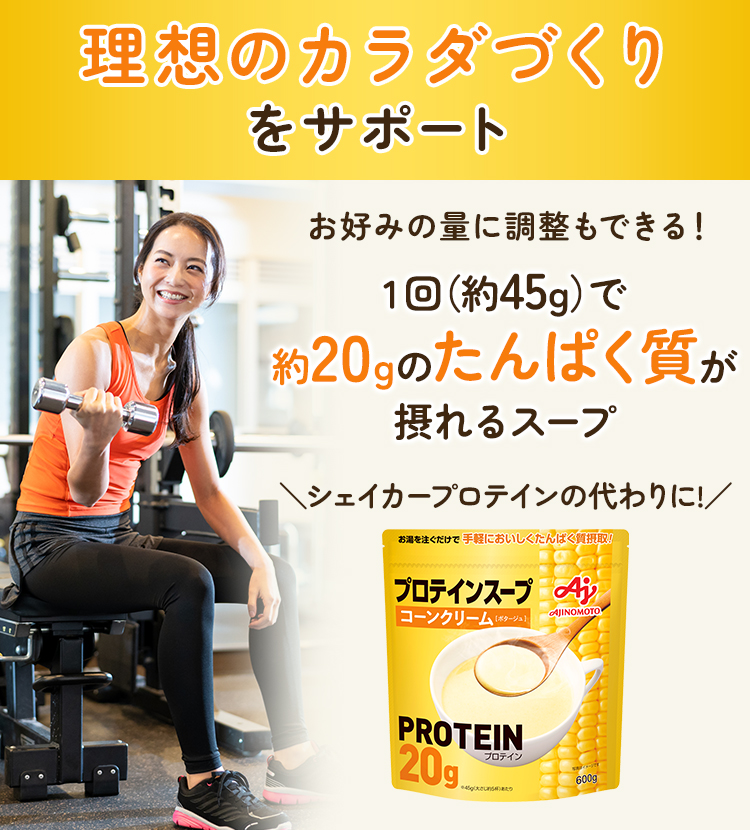 からだのもととなるたんぱく質が1回で20g摂れるスープです。チャック付きの大きな袋に600g入っており、お好みの量に調整することが可能です。朝食や昼食、間食時、運動後にお湯を注ぐだけで手軽においしく食べられ、理想のカラダづくりに役立ちます。