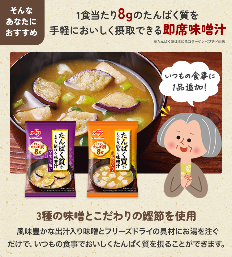 ・原材料名コラーゲンペプチド(国内製造)、粉末味噌、乾燥揚げなす、デキストリン、乾燥油揚げ、かつお節粉末、乾燥ねぎ、乳糖、かつおエキス、砂糖、酵母エキス、でん粉、大豆たん白加水分解物、小麦・大豆発酵調味料/調味料(アミノ酸等)、豆腐用凝固剤、酸化防止剤(V.E)