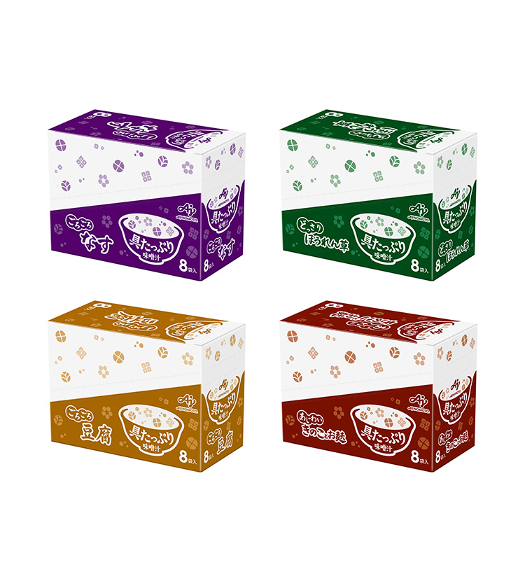 ・原材料名〈定番〉なす粉末味噌(国内製造)、乾燥揚げなす、乾燥油揚げ、デキストリン、乾燥ねぎ、かつお節粉末、乳糖、かつおエキス、砂糖、酵母エキス、でん粉、こんぶエキス、かつお節エキス、小麦発酵調味料/調味料(アミノ酸等)、加工デンプン、豆腐用凝固剤、膨脹剤、環状オリゴ糖、酸化防止剤(V.E)〈定番〉ほうれん草粉末味噌(国内製造)、乾燥ほうれん草、デキストリン、乾燥油揚げ、かつお節粉末、乳糖、かつおエキス、砂糖、酵母エキス、でん粉、こんぶエキス、かつお節エキス、小麦発酵調味料/調味料(アミノ酸等)、加工デンプン、豆腐用凝固剤、膨張剤、環状オリゴ糖、酸化防止剤(V.E)〈定番〉きのことお麩粉末味噌(国内製造)、乾燥ぶなしめじ、デキストリン、麩、乾燥ねぎ、かつお節粉末、乳糖、かつおエキス、砂糖、酵母エキス、でん粉、こんぶエキス、かつお節エキス、小麦発酵調味料/調味料(アミノ酸等)、加工デンプン、ソルビトール、酸化防止剤(V.E)、環状オリゴ糖〈定番〉豆腐粉末味噌(国内製造)、乾燥豆腐、デキストリン、乾燥ねぎ、乾燥わかめ、かつお節粉末、乳糖、かつおエキス、砂糖、酵母エキス、でん粉、こんぶエキス、かつお節エキス、小麦発酵調味料/調味料(アミノ酸等)、加工デンプン、豆腐用凝固剤、環状オリゴ糖