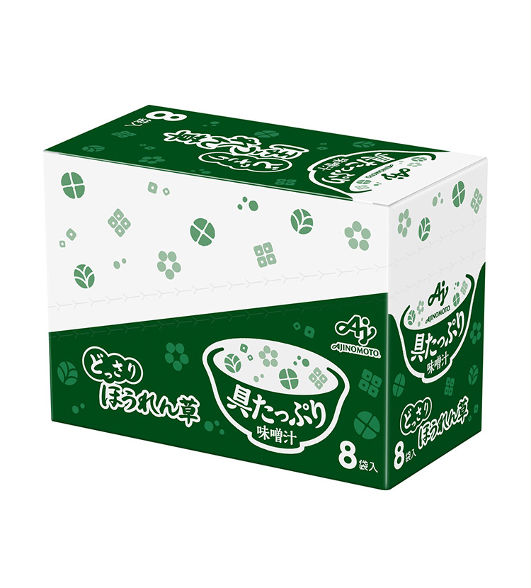 ・原材料名粉末味噌(国内製造)、乾燥ほうれん草、デキストリン、乾燥油揚げ、かつお節粉末、乳糖、かつおエキス、砂糖、酵母エキス、でん粉、こんぶエキス、かつお節エキス、小麦発酵調味料/調味料(アミノ酸等)、加工デンプン、豆腐用凝固剤、膨張剤、環状オリゴ糖、酸化防止剤(V.E)