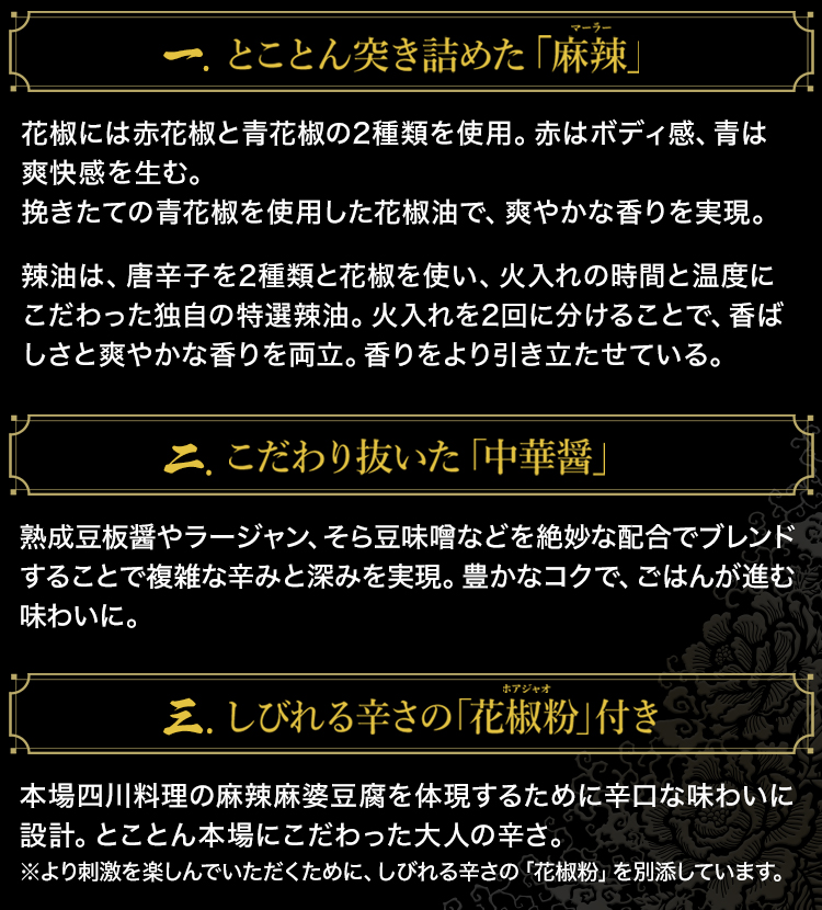 極のこだわり 麻辣麻婆豆腐の極は、一体どんな味なのだろうか。 ひたすらおいしさに向き合った逸品がついに完成。