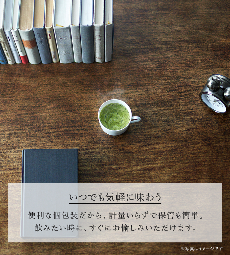 ・栄養成分表示本品1杯分(7.5g)あたりエネルギー29kcal、たんぱく質0.46g、脂質0.12g、炭水化物6.5g、食塩相当量0.02g、ポリフェノール190mg、テアニン20mg、カフェイン38mg、カリウム30mg、リン6mg