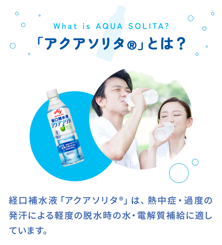 経口補水液「アクアソリタ®」は、熱中症・過度の発汗による軽度の脱水時の水・電解質補給に適しています。