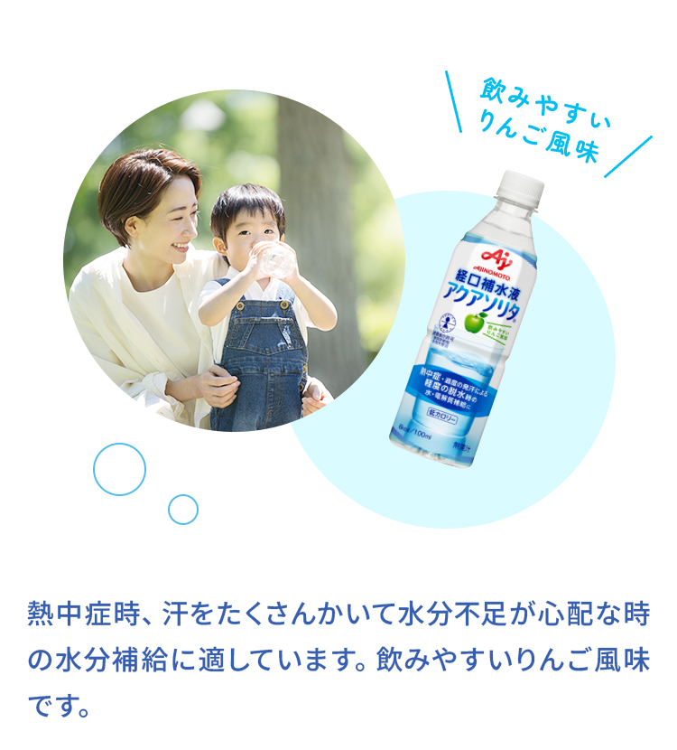 熱中症時、汗をたくさんかいて水分不足が心配な時の水分補給に適しています。飲みやすいりんご風味です。