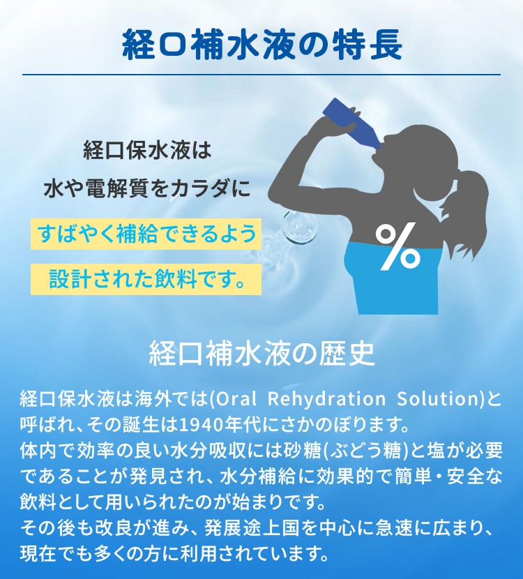 経口保水液は海外では(Oral Rehydration Solution)と呼ばれ、その誕生は1940年代にさかのぼります。 体内で効率の良い水分吸収には砂糖(ぶどう糖)と塩が必要であることが発見され、水分補給に効果的で簡単・安全な飲料として用いられたのが始まりです。 その後も改良が進み、発展途上国を中心に急速に広まり、現在でも多くの方に利用されています。