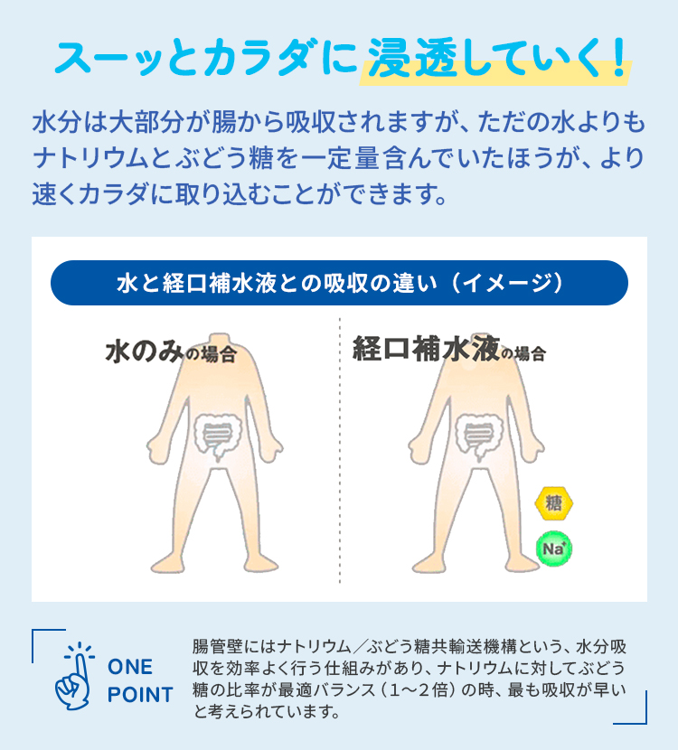水分は大部分が腸から吸収されますが、ただの水よりもナトリウムとぶどう糖を一定量含んでいたほうが、より速くカラダに取り込むことができます。