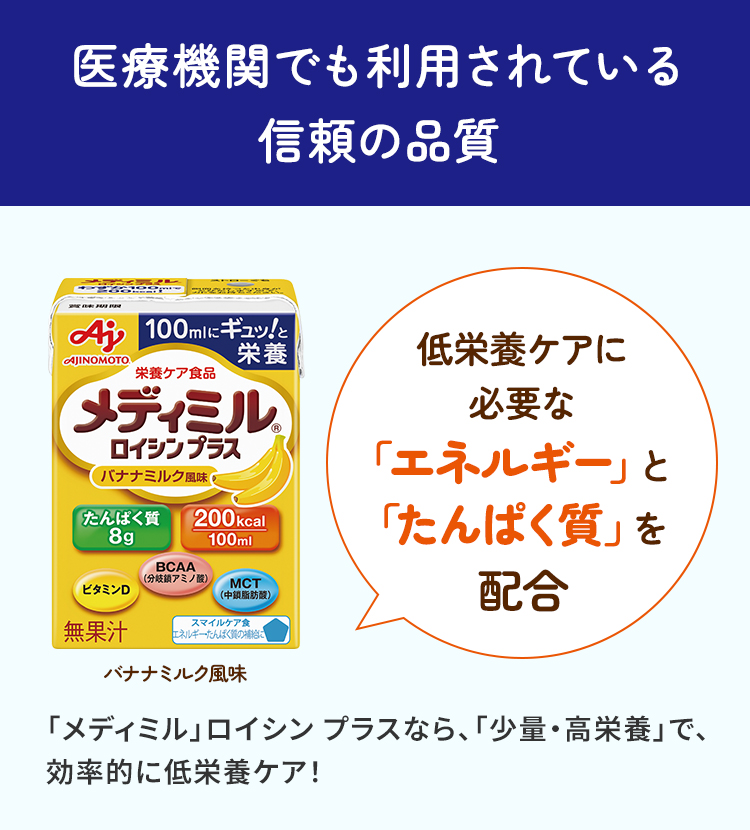 「メディミル」ロイシン プラスなら、「少量・高栄養」で、効率的に低栄養ケア!