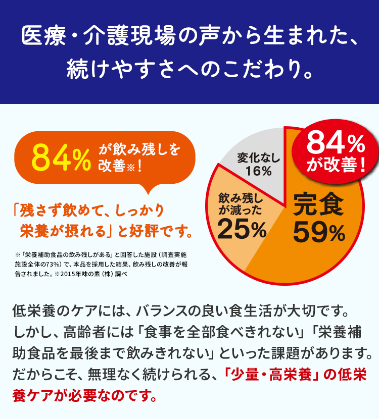 「より少量でしっかり栄養が摂れる栄養補助食品が欲しい」という医療・介護スタッフ様の声を参考に、味の素(株)独自の製造技術で、業界最小サイズの100mlを実現しました。
