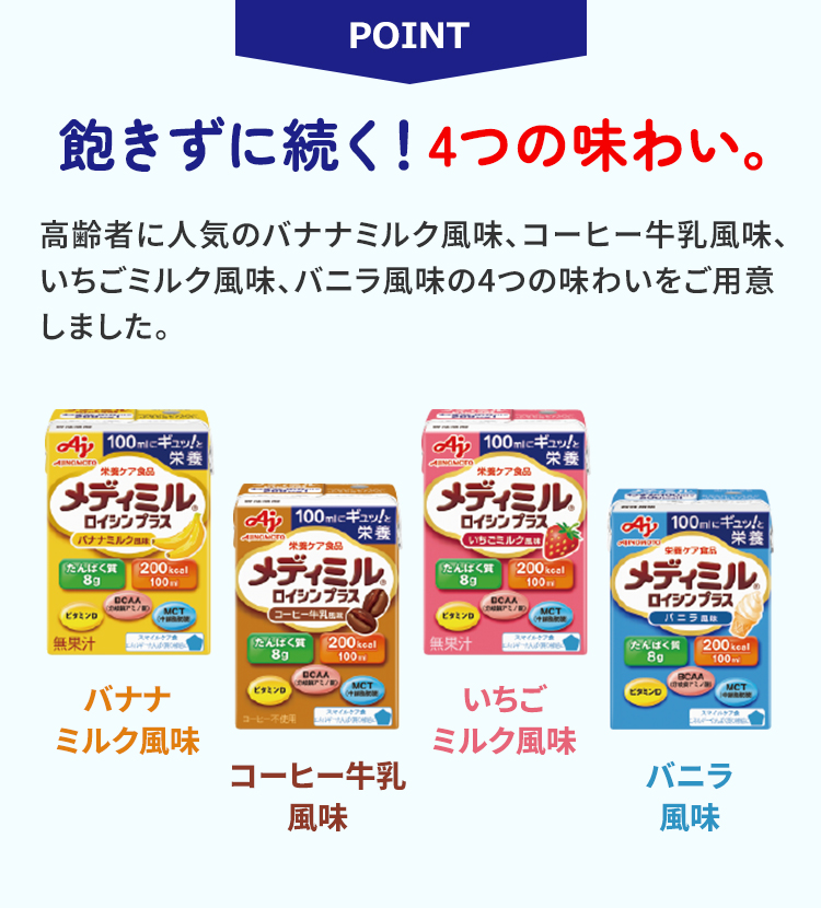 高齢者に人気のバナナミルク風味、コーヒー牛乳風味、いちごミルク風味、バニラ風味の4つの味わいをご用意しました。