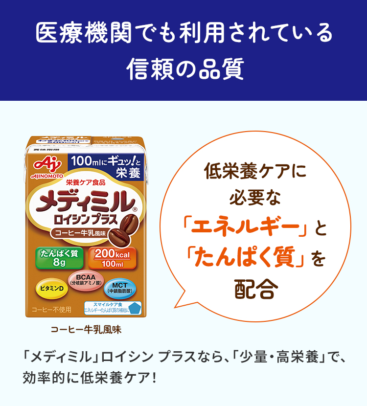 「メディミル」ロイシン プラスなら、「少量・高栄養」で、効率的に低栄養ケア!