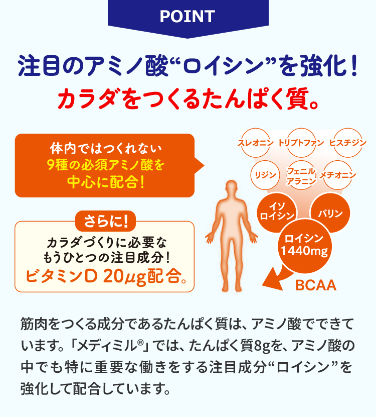 筋肉をつくる成分であるたんぱく質は、アミノ酸でできています。「メディミル®」では、たんぱく質8gを、アミノ酸の中でも特に重要な働きをする注目成分“ロイシン”を強化して配合しています。 (中鎖脂肪酸トリグリセライド)を配合しています。