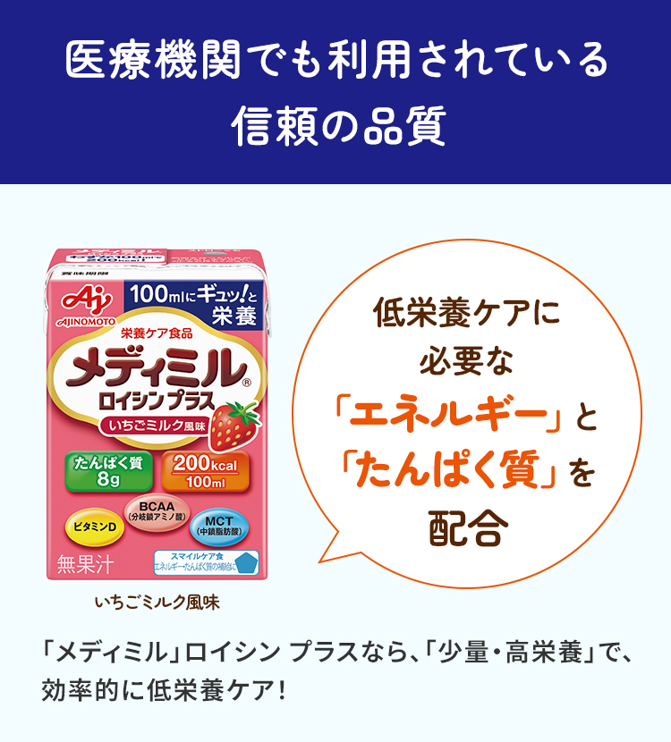 「メディミル」ロイシン プラスなら、「少量・高栄養」で、効率的に低栄養ケア!