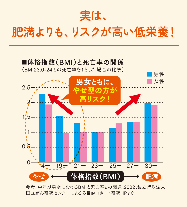肥満とやせているのは、どっちが不健康だと思いますか?実は高齢になると、低栄養によってやせている方が、健康リスクが高まることがわかっています。