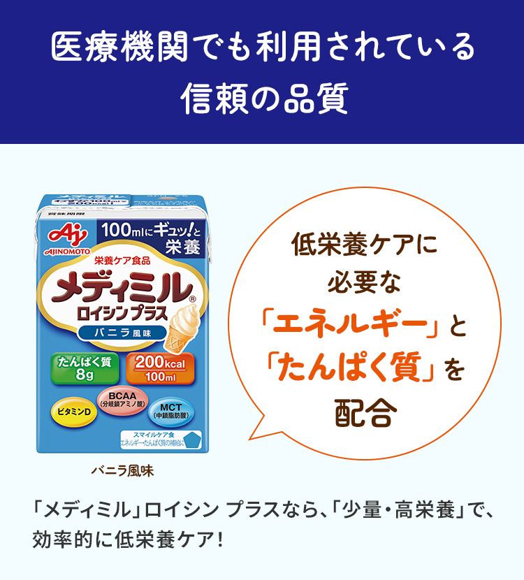 「メディミル」ロイシン プラスなら、「少量・高栄養」で、効率的に低栄養ケア!