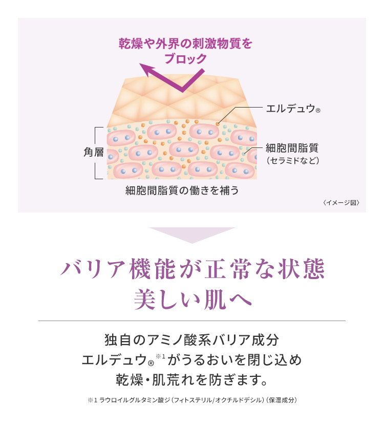 独自のアミノ酸系バリア成分 エルデュウ®*1がうるおいを閉じ込め、 乾燥・肌荒れを防ぎます。 年齢とともに減少する角層細胞間脂質のひとつであるセラミドと似た働きをすることで、バリア機能をサポート。乾燥や外界の刺激物質をブロックし、健やかな肌を保ちます。 *1 ラウロイルグルタミン酸ジ(フィトステリル/オクチルドデシル)(保湿成分)