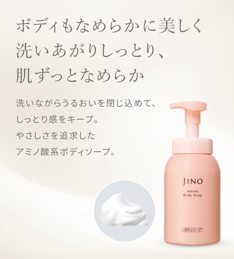 「ジーノ」のアミノ酸系洗浄成分は、泡量や泡質に優れ、クリーミーで豊かな泡立ちを実現します。キメ細かな泡がふんわりと肌を包み込み、さっぱりと洗い上げながらも、洗った後の肌は乾燥することなく、みずみずしさを保ち続けます。