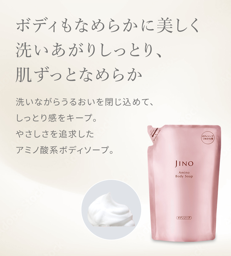 「ジーノ」のアミノ酸系洗浄成分は、泡量や泡質に優れ、クリーミーで豊かな泡立ちを実現します。キメ細かな泡がふんわりと肌を包み込み、さっぱりと洗い上げながらも、洗った後の肌は乾燥することなく、みずみずしさを保ち続けます。