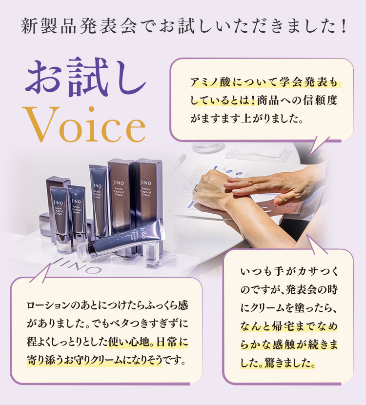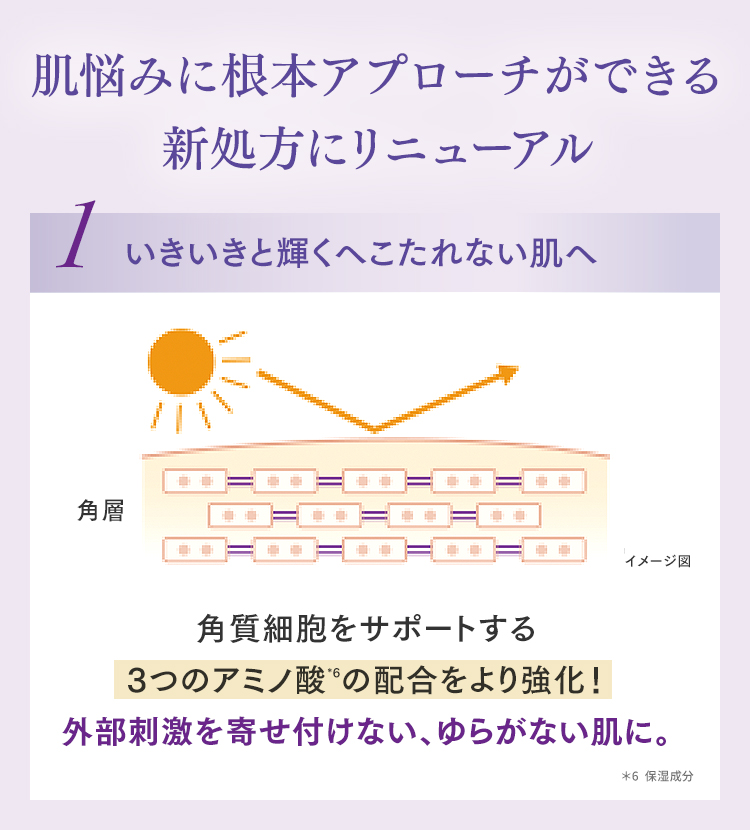 ・原材料名水、グリセリン、スクワラン、ジメチコン、BG、ベヘニルアルコール、メドウフォーム油、アルギニン、リシンHCl、トリステアリン酸ポリグリセリル-10、トレオニン、 ヒスチジン、 バリン、 ロイシン、 イソロイシン、 カルノシン、 カプロイルプロリンNa、 トリプトファン、 アセチルシステイン、 アスパラギン酸、 フェニルアラニン、 ラウロイルグルタミン酸ジ(フィトステリル/オクチルドデシル)、 ラウロイルグルタミン酸ジ(オクチルドデシル/フィトステリル/ベヘニル)、 グリシン、 PCA-Na、 グルタミン酸Na、 アラニン、 プロリン、 セリン、 ベタイン、 ココイルアルギニンエチルPCA、 グアイアズレンスルホン酸Na、リン酸アスコルビルMg、トコフェロール、カニナバラ果実エキス、ユーカリエキス、セイヨウアブラナ種子油、水添レシチン、ステアリン酸グリセリル、カルボマー、エチドロン酸、フェノキシエタノール、EDTA-2Na、エタノール ●赤字はアミノ酸およびアミノ酸誘導体です。