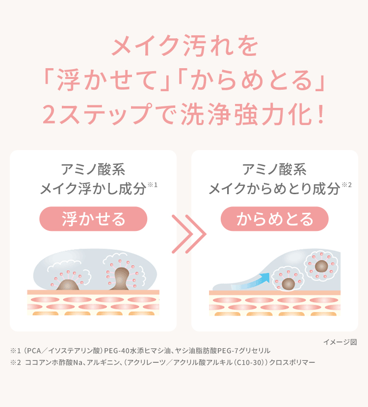 アミノ酸系メイク浮かし成分※1とアミノ酸系からめとり成分※2が、メイク汚れを浮かせてからめとる2段階洗浄を実現しました。肌へのやさしさはそのままで、メイクをしっかり落とします。