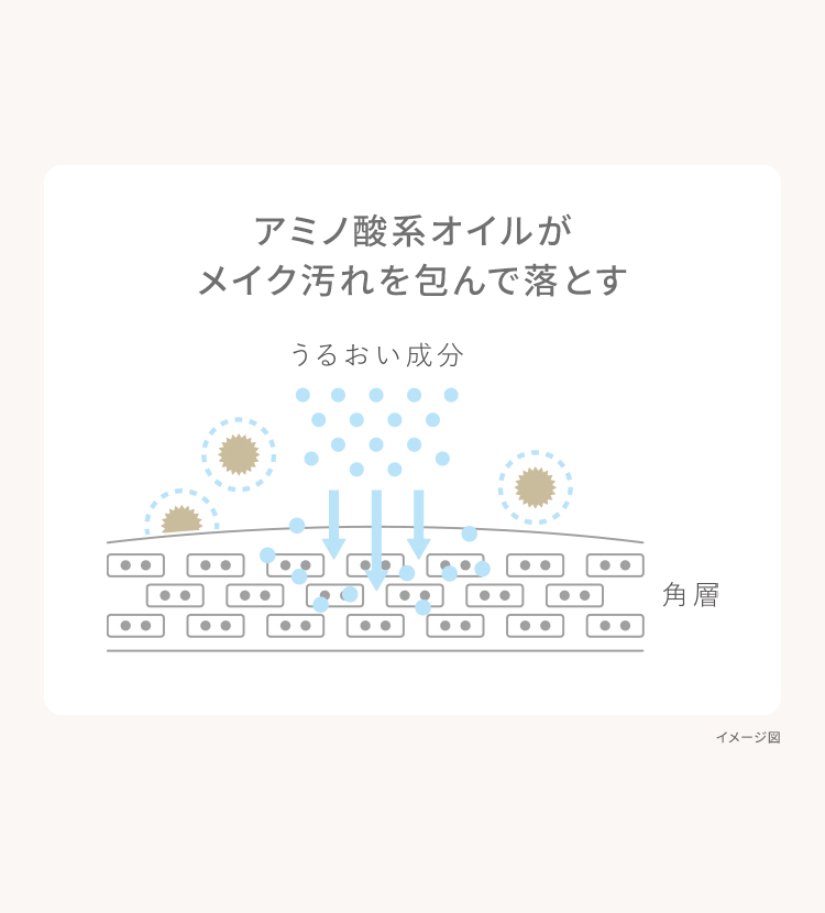美容成分がたっぷり入ったアミノ酸系オイルが、肌に摩擦を与えず、うるおいを与えながら、どんなメイクもするっと落とします。