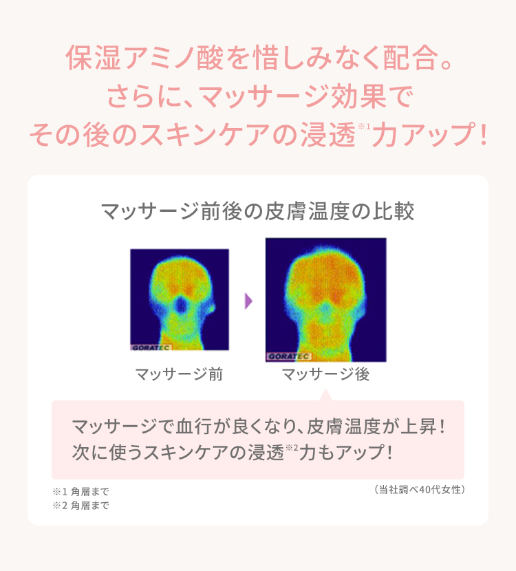 保湿アミノ酸「セリン」「アルギニン」「PCA」を配合。その後のスキンケアと組み合わせると、さらにうるおい力がアップします。また、マッサージで肌がほぐれることで化粧水の浸透※2も高まり、朝は化粧のりがぐんとよくなります。