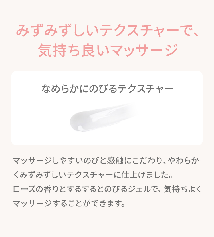 マッサージしやすいのびと感触にこだわり、やわらかくみずみずしいテクスチャーに仕上げました。 ローズの香りとするするとのびるジェルで、気持ちよくマッサージすることができます。