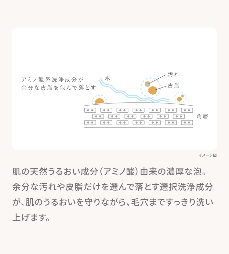 肌の天然うるおい成分(アミノ酸)由来の濃厚な泡。余分な汚れや皮脂だけを選んで落とす選択洗浄成分が、肌のうるおいを守りながら、毛穴まですっきり洗い上げます。