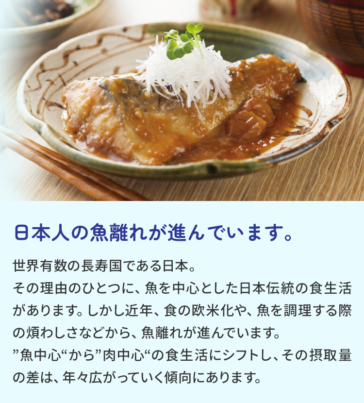 その理由のひとつに、魚を中心とした日本伝統の食生活があります。しかし近年、食の欧米化や、魚を調理する際の煩わしさなどから、魚離れが進んでいます。