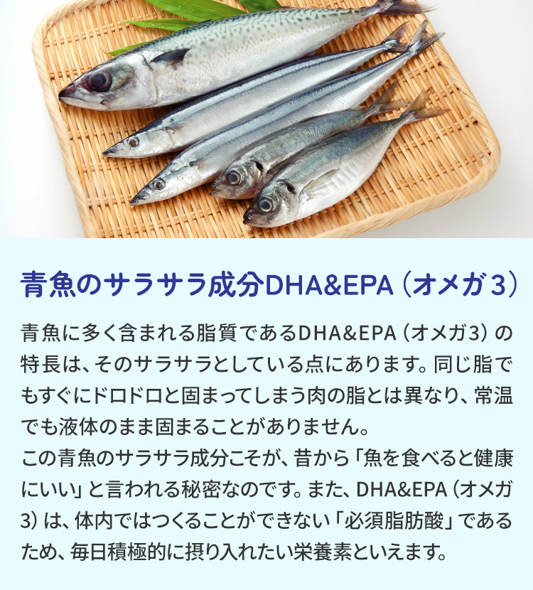 この青魚のサラサラ成分こそが、昔から「魚を食べると健康にいい」と言われる秘密なのです。また、DHA&EPA(オメガ3)は、体内ではつくることができない「必須脂肪酸」であるため、毎日積極的に摂り入れたい栄養素といえます。
