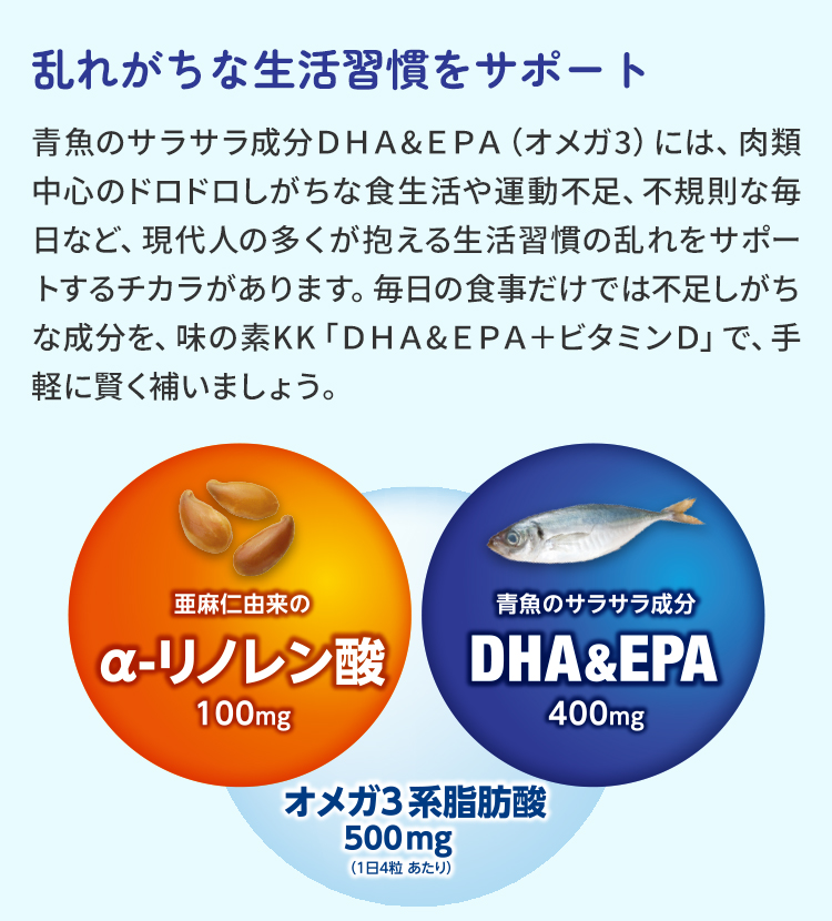青魚のサラサラ成分DHA&EPA(オメガ3)には、肉類中心のドロドロしがちな食生活や運動不足、不規則な毎日など、現代人の多くが抱える生活習慣の乱れをサポートするチカラがあります。毎日の食事だけでは不足しがちな成分を、味の素KK「DHA&EPA+ビタミンD」で、手軽に賢く補いましょう。