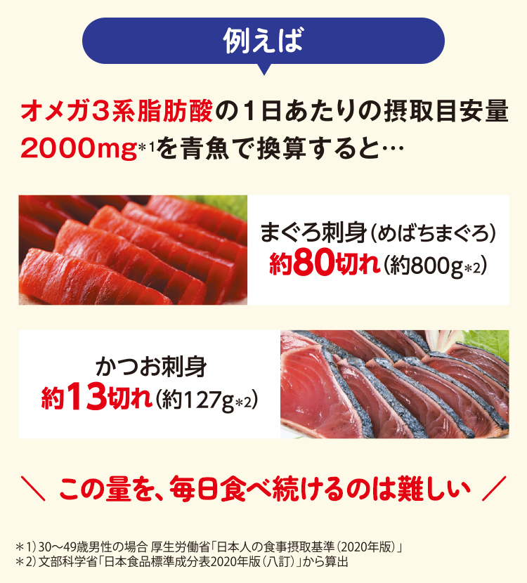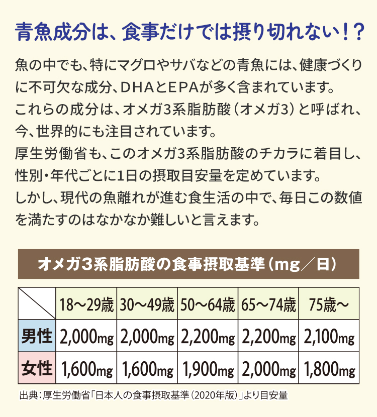 厚生労働省も、このオメガ3系脂肪酸のチカラに着目し、性別・年代ごとに1日の摂取目安量を定めています。
