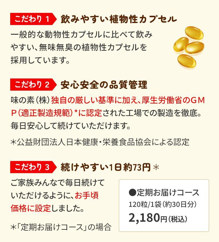 造を徹底。毎日安心して続けていただけます。 *公益財団法人日本健康・栄養食品協会による認定で、GMPはGood ManufacturingPracticeの略