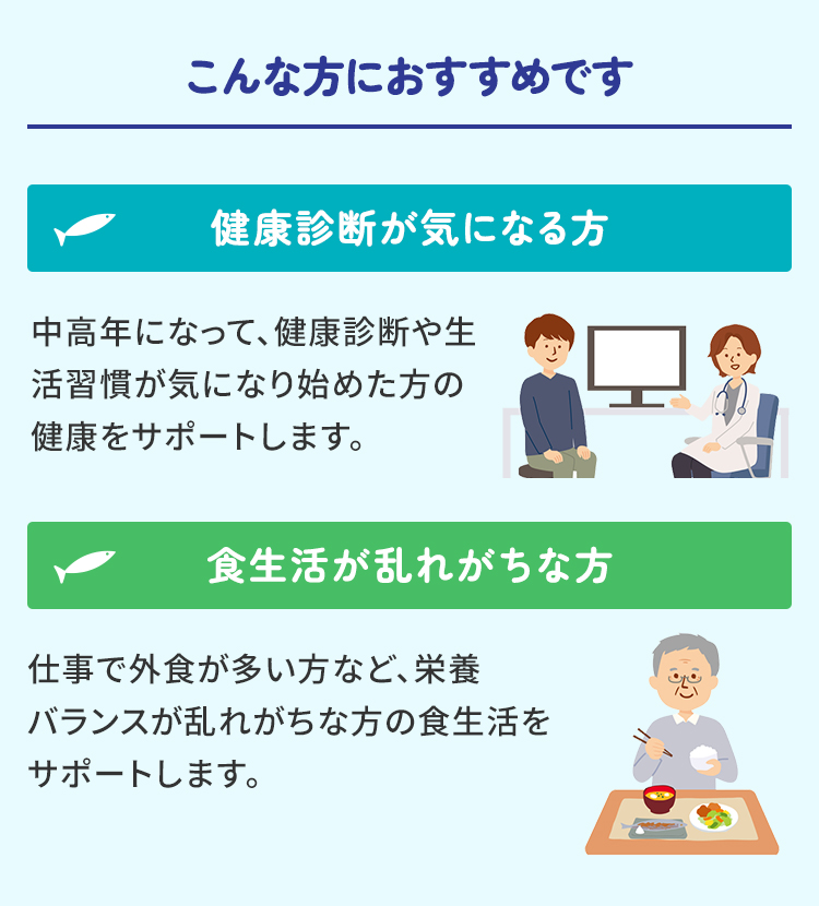中高年になって、健康診断や生活習慣が気になり始めた方の健康をサポートします。