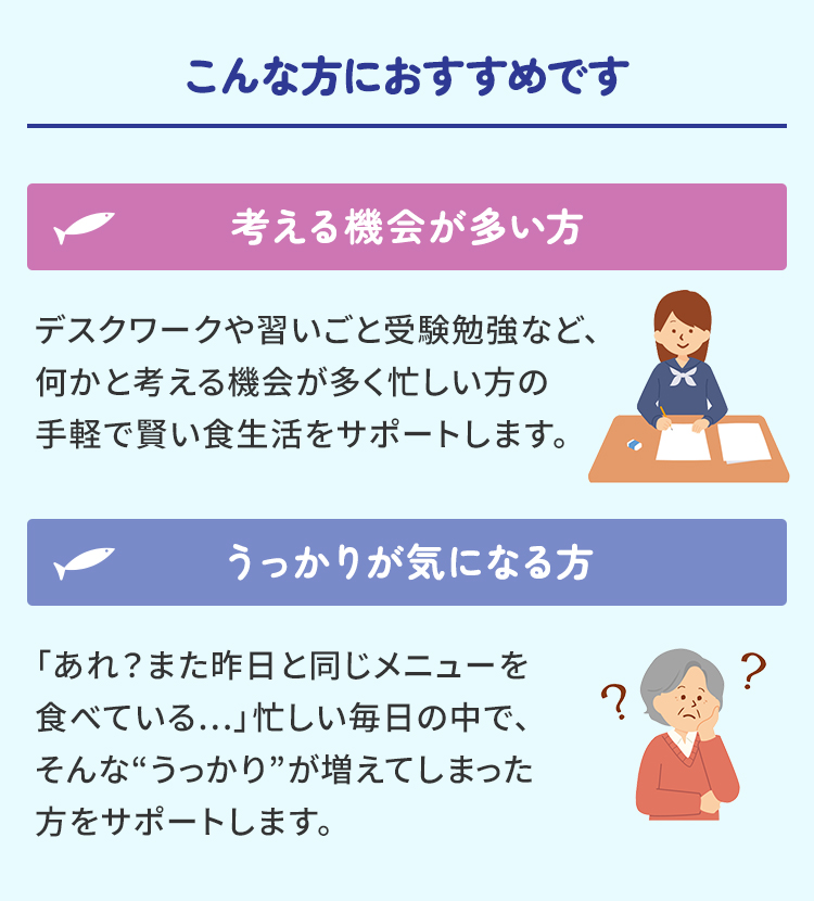 「あれ?また昨日と同じメニューを食べている…」忙しい毎日の中で、そんな“うっかり”が増えてしまった方をサポートします。