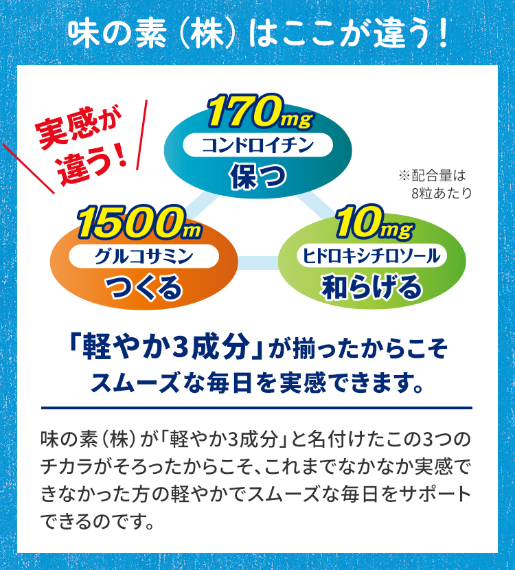 味の素(株)が「軽やか3成分」と名付けたこの3つのチカラがそろったからこそ、これまでなかなか実感できなかった方の軽やかでスムーズな毎日をサポートできるのです。