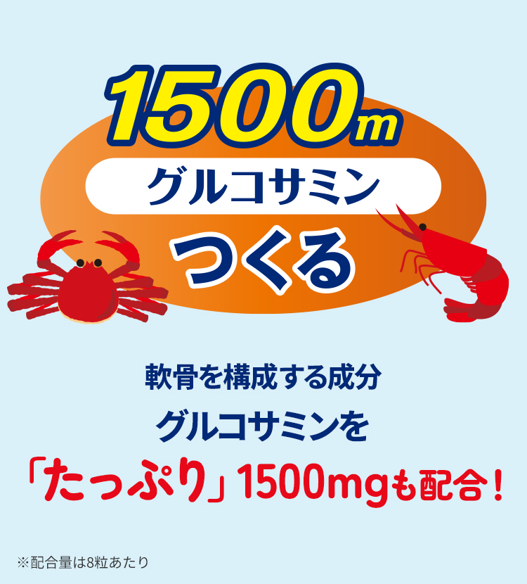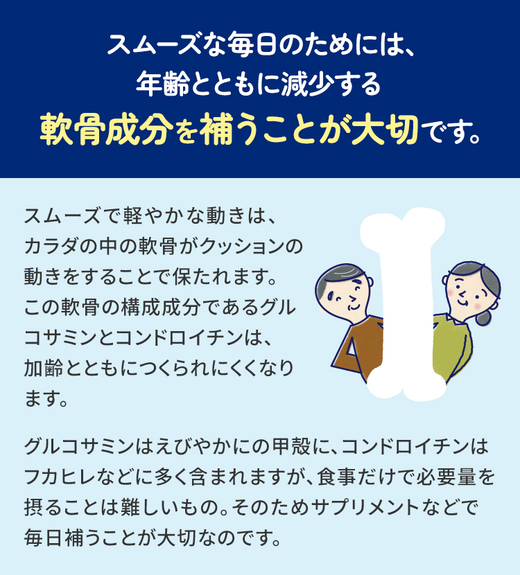 スムーズで軽やかな動きは、カラダの中の軟骨がクッションの動きをすることで保たれます。 この軟骨の構成成分であるグルコサミンとコンドロイチンは、加齢とともにつくられにくくなります。 グルコサミンはえびやかにの甲殻に、コンドロイチンはフカヒレなどに多く含まれますが、食事だけで必要量を摂ることは難しいもの。そのためサプリメントなどで毎日補うことが大切なのです。