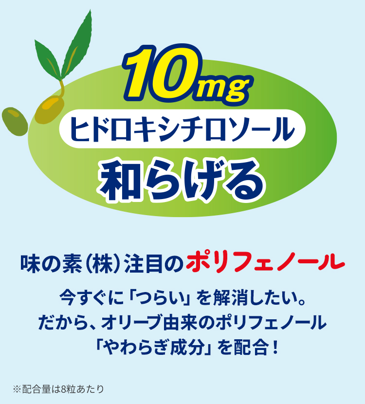 今すぐに「つらい」を解消したい。 だから、オリーブ由来のポリフェノール 「やわらぎ成分」を配合!