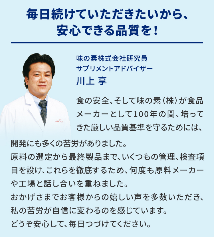 食の安全、そして味の素(株)が食品メーカーとして100年の間、培ってきた厳しい品質基準を守るためには、開発にも多くの苦労がありました。 原料の選定から最終製品まで、いくつもの管理、検査項目を設け、これらを徹底するため、何度も原料メーカーや工場と話し合いを重ねました。 おかげさまでお客様からの嬉しい声を多数いただき、私の苦労が自信に変わるのを感じています。 どうぞ安心して、毎日つづけてください。