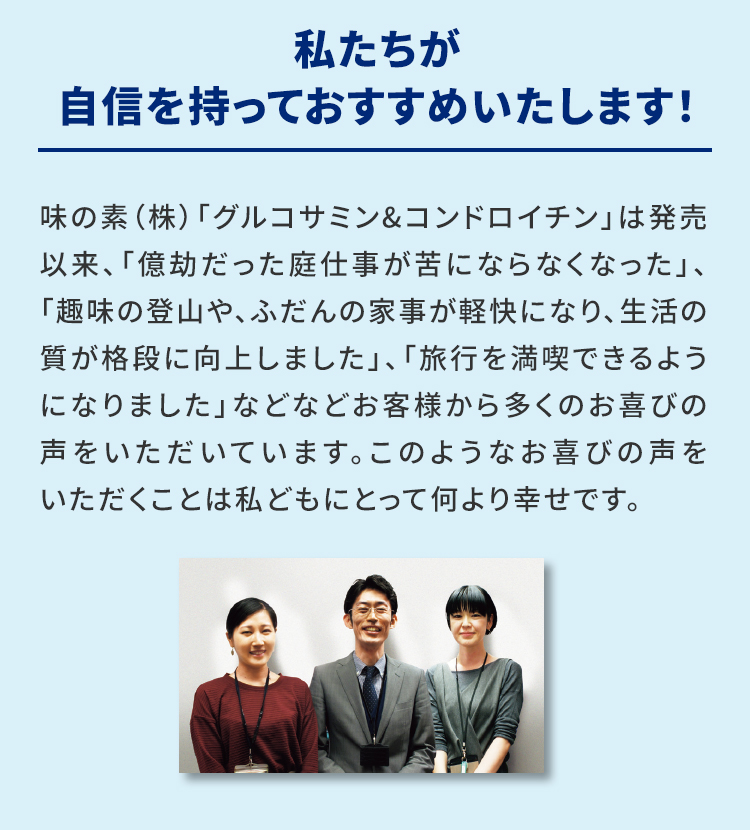 味の素(株)「グルコサミン&コンドロイチン」は発売以来、「億劫だった庭仕事が苦にならなくなった」、「趣味の登山や、ふだんの家事が軽快になり、生活の質が格段に向上しました」、「旅行を満喫できるようになりました」などなどお客様から多くのお喜びの声をいただいています。このようなお喜びの声をいただくことは私どもにとって何より幸せです。