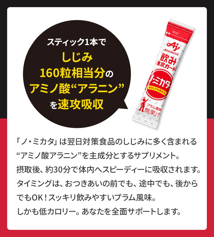 「ノ・ミカタ」は翌日対策食品のしじみに多く含まれる“アミノ酸アラニン”を主成分とするサプリメント。摂取後、約30分で体内へスピーディーに吸収されます。 タイミングは、おつきあいの前でも、途中でも、後からでもOK!スッキリ飲みやすいプラム風味。しかも低カロリー。あなたを全面サポートします。 スマートな大人へ。スマートな明日へ。今夜の味方、「ノ・ミカタ」です。
